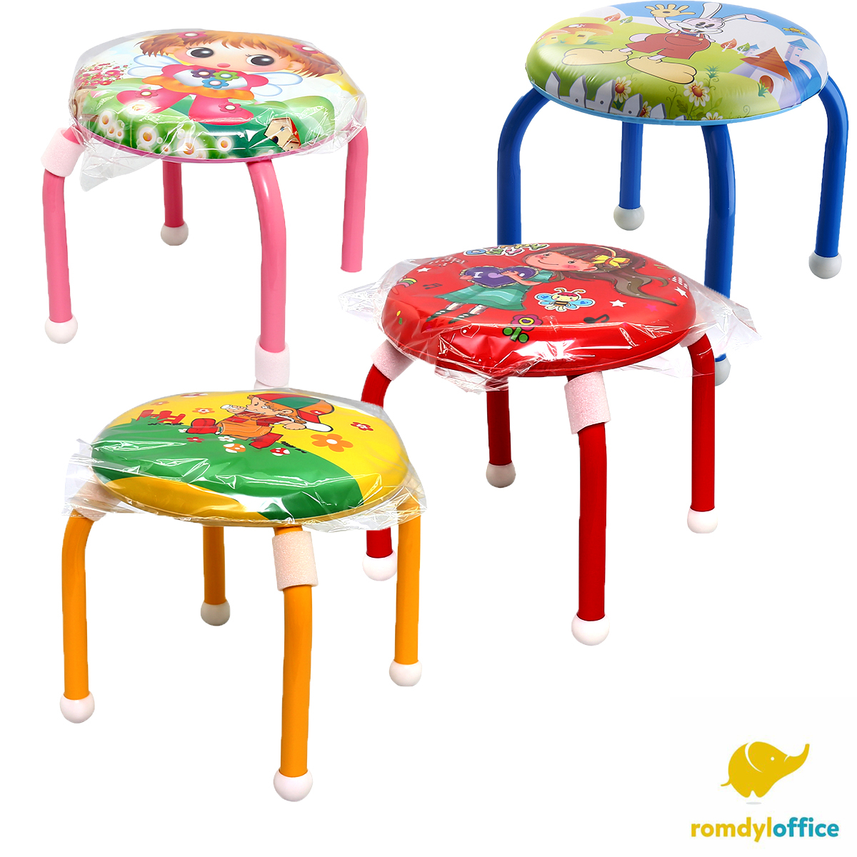- Scaunul pentru copii este realizat din metal, cu sezutul confectionat din burete acoperit cu material PVC pe structura metalica. Imbracamintea din PVC are frumoase desene, potrivite pentru cei mici.